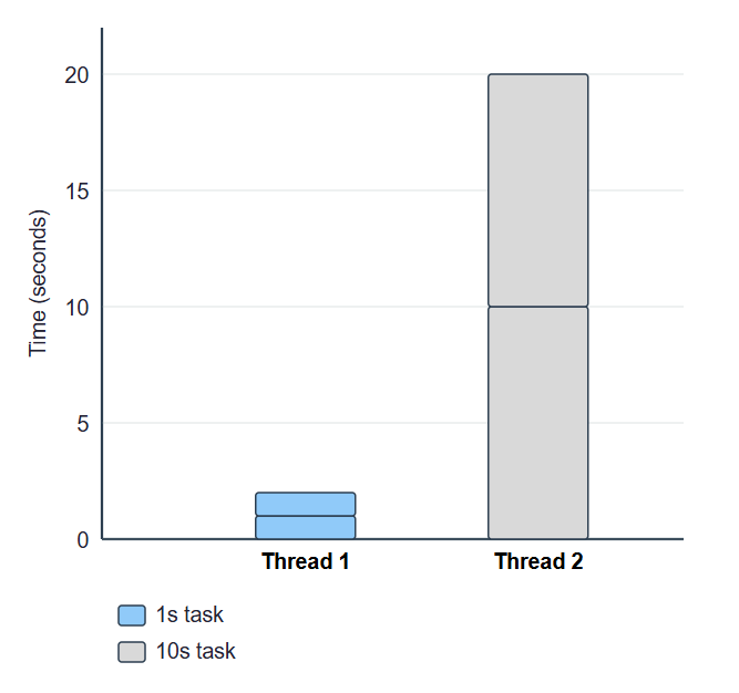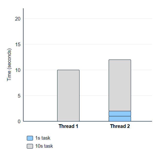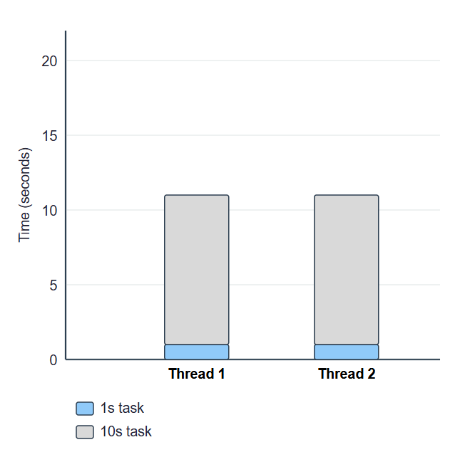 To illustrate this, I’ll use a simple example where there are 2 threads and 4 tasks. 2 of the tasks take 1 second to run, while the other 2 take 10 seconds to run. If the tasks are split into groups, then the best-case scenario is each group contains a 1 second task and a 10 second task. Total execution time in this scenario is 11 seconds.